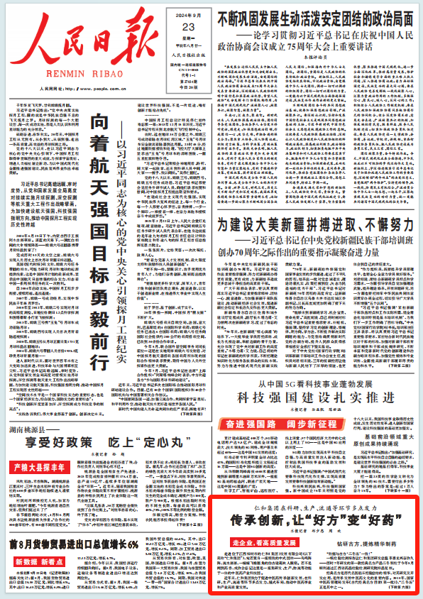 傳承創(chuàng)新,讓“好方”變“好藥” ——《人民日報》9月23日頭版點贊仁和集團