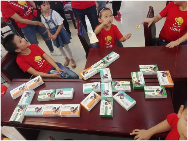 孩子們分組用“米阿卡”系列的樣品盒進行折盒子比賽,孩子們腦洞大開,排成各種形狀,還有小朋友用樣品盒擺出了“仁和”兩個字。